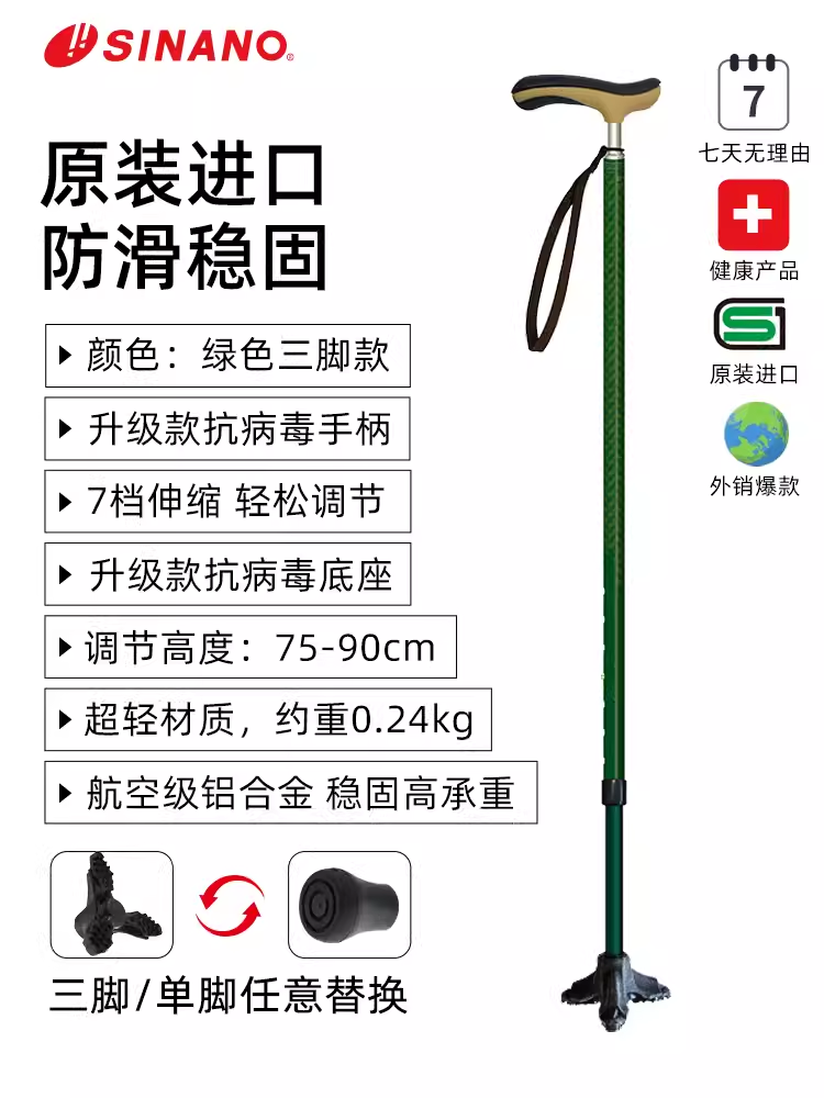 1. The product is made of aluminum alloy pipe, with a surface of fog silver treatment with a diameter of 25.4mm and a thickness of 1.25mm, which is light for the elderly; 2. The intermediate casing is designed as a special-shaped pipe; 3. One-key quick opening, foldable and easy to carry; 4. Patented structure design, quality assurance; 5. It can be used as a crutch or a chair.