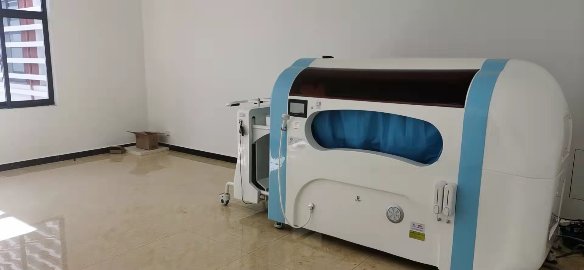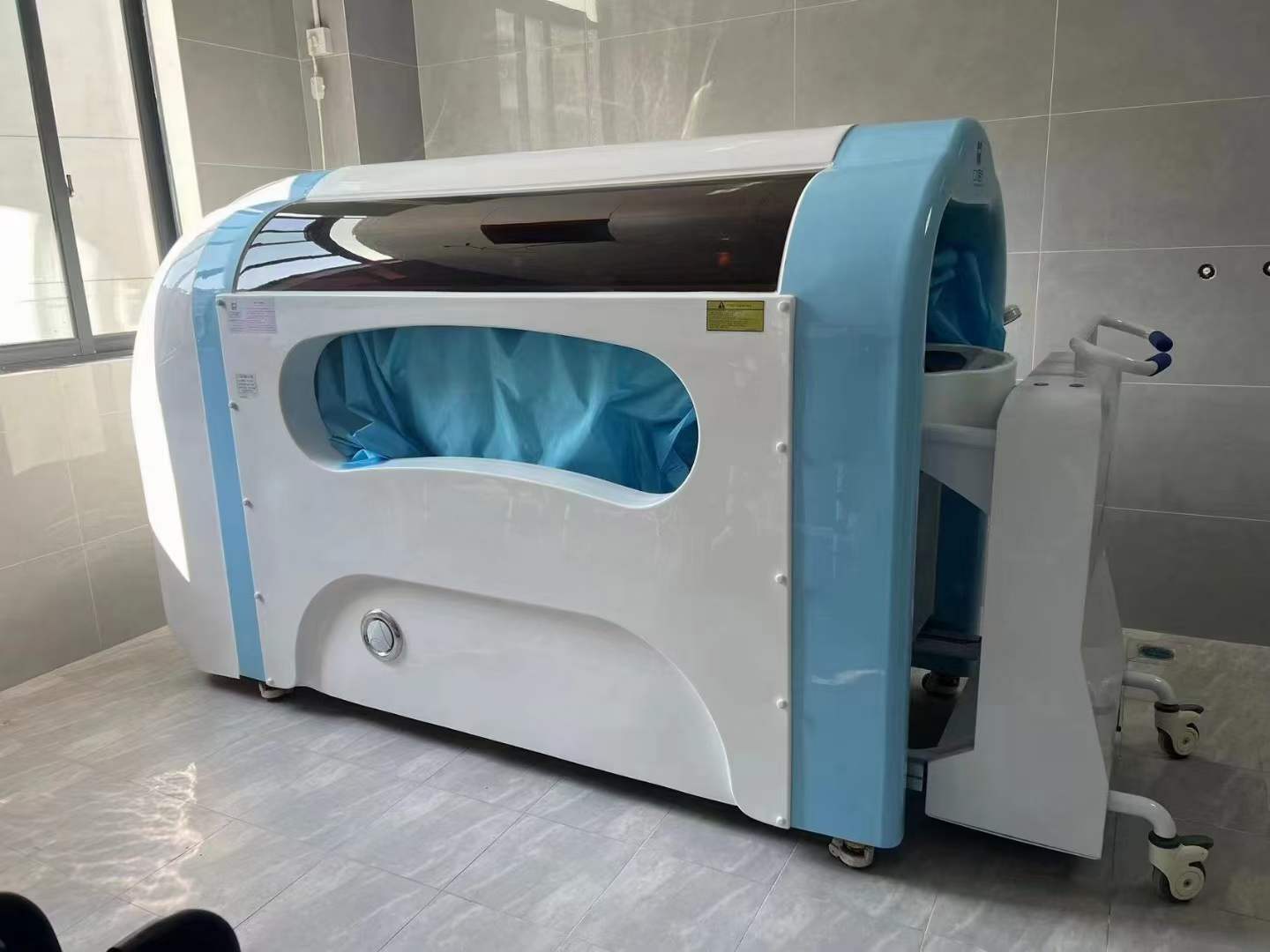 Barrier-free automatic bath machine is specifically designed for disabled, semi-disabled elderly individuals and postoperative rehabilitation patients. With one-button activation, it provides constant-temperature full-body cleansing. Its 25 electric omnidirectional spray heads combine with 250μm micro-particle hydrotherapy and music therapy to soothe emotions. The stainless steel + acrylic waterproof chamber features semi-transparent observation windows on both sides for easy care monitoring. Equipped with an automatic lifting trolley, water-electric separation system, and dual leakage protection, it ensures effortless transfer. Post-washing warm air drying and head drying are provided, along with ozone-ultraviolet dual disinfection and self-cleaning pipes. Certified with CE, listed in the National Rehabilitation Assistive Devices Catalog, and compliant with the latest national standards, this device is suitable for hospitals, nursing homes, communities, and households.