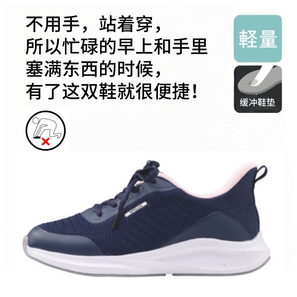 Hands-free shoes that can be put on while standing, without using hands or bending over. They are suitable for the elderly, pregnant women and people with physical inconveniences.
