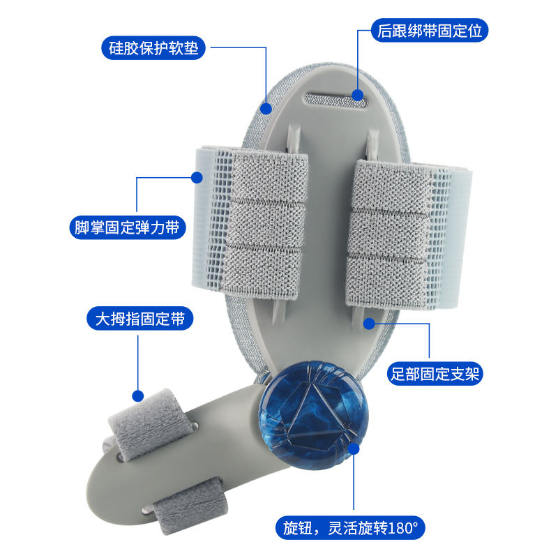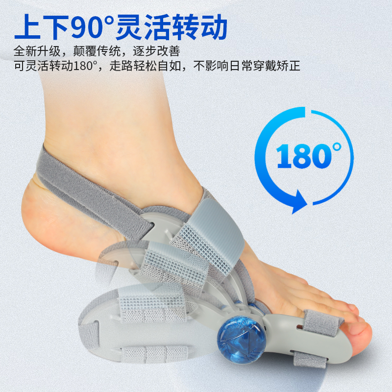 Indications: Hallux valgus,bunions, Prevent foot deformities from worsening. Features: 1.The bunion corrector is innovatively designed to rotate up to 180° laterally and 90° up and down. 2.Easy adjustment with a simple twist, providing painless correction,increasing daily usability and comfort. 3.Breathable,durable and provide a snug fit that accommodates the natural contour of your foot.