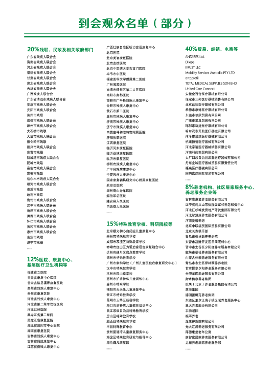 Organized by the China Disabled Persons' Federation, the Care & Rehabilitation Expo China (CR Expo) stands as China's premier rehabilitation and assistive technology event, showcasing diverse products including mobility aids, prosthetics & orthotics, rehabilitation and pediatric solutions, elderly assistive devices, and accessibility technologies. It convenes global professional buyers, with domestic participants spanning disability federations at all administrative levels, civil affairs agencies, medical rehabilitation institutions, senior care facilities, and distributors, while international procurement delegations encompass rehabilitation centers, hospitals, aged care service providers, local distributors, and import/export traders from Europe/Americas (Germany, US, Netherlands, Sweden), Middle East, Japan/Korea, Southeast Asia, and Australia.