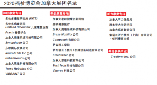 加拿大展團的26家展商中包括了加拿大知名的康復研發(fā)和臨床服務機構:多倫多康復研究所、多倫多病童醫(yī)院、Holland BloorView兒童康復醫(yī)院、加拿大老齡創(chuàng)新網(wǎng)、Praxis脊髓學會、加拿大聽力服務局、及渥太華大學醫(yī)學院。以及19家有著先進康復解決方案的創(chuàng)新企業(yè)及其產(chǎn)品, 產(chǎn)品廣泛涵蓋上肢康復、帕金森凍僵步態(tài)康復、養(yǎng)老護理、腦健康評估等。 詳情請查看資料架的展團手冊和各展商的在線展臺。