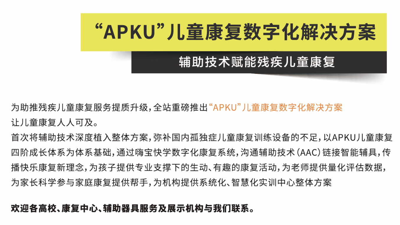 打造智慧化解決方案,讓兒童康復人人可及 為助力兒童康復服務(wù)提質(zhì)升級,全站以輔助技術(shù)為核心,賦能兒童康復全過程 推出兒童康復數(shù)字化實訓解決方案,本方案以APKU兒童康復四階段成長體系為基礎(chǔ),通過數(shù)字化康復系統(tǒng)及溝通輔助技術(shù)(AAC),鏈接感統(tǒng)、言語等多鞥例康復智能化訓練設(shè)備,傳播快樂康復新理念。