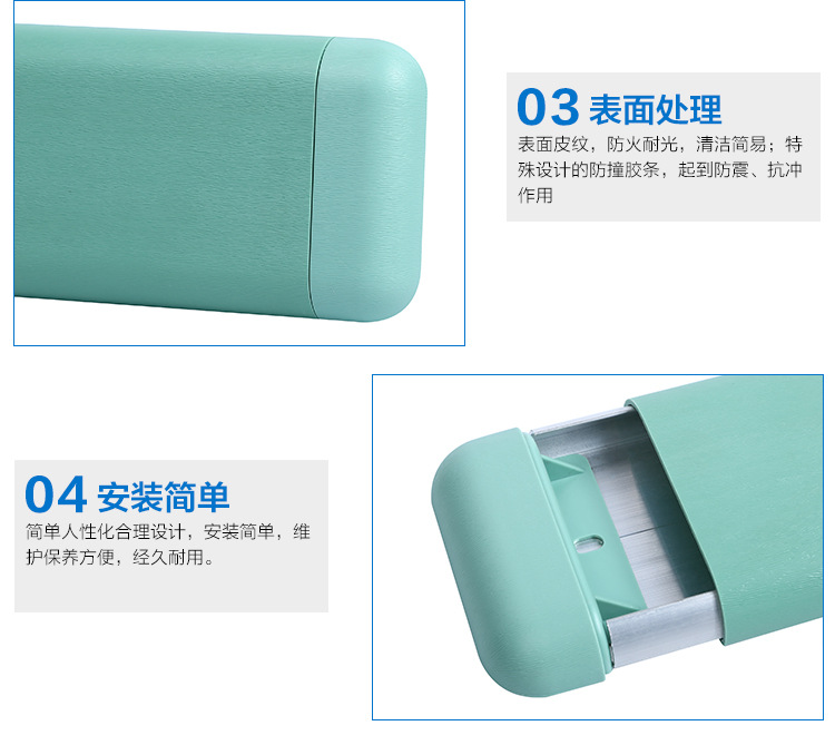 抗菌防撞護板采用高聚物PVC為外飾物,此PVC有防火、防腐、抗菌、易清潔等效果;安裝簡單,津貼墻面,維護保養(yǎng)方便,經(jīng)久耐用;3、款式多樣,寬窄均可,色彩豐富;護板內(nèi)芯為優(yōu)質鋁合金專業(yè)設計,緊固合理;表面批文,防火耐光,清潔簡易;抗菌防撞護板和抗菌防撞扶手一起使用,整體保護墻面,防撞、抗擊、抗沖。