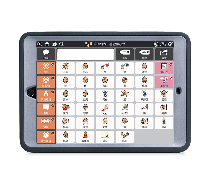 SC溝通平板是一款A(yù)AC輔助溝通設(shè)備,專(zhuān)為有溝通障礙的人群使用,如自閉癥、腦癱、腦卒中、腦外傷等。 ? 配有手柄和支架,方便用戶攜帶。經(jīng)過(guò)安全測(cè)試可承受撞擊和跌落,同時(shí)配有防撞角和屏幕保護(hù)框架。核心軟件為AAC溝通軟件 TD Snap,通過(guò)TD Snap 架起溝通的橋梁,自由表達(dá)。