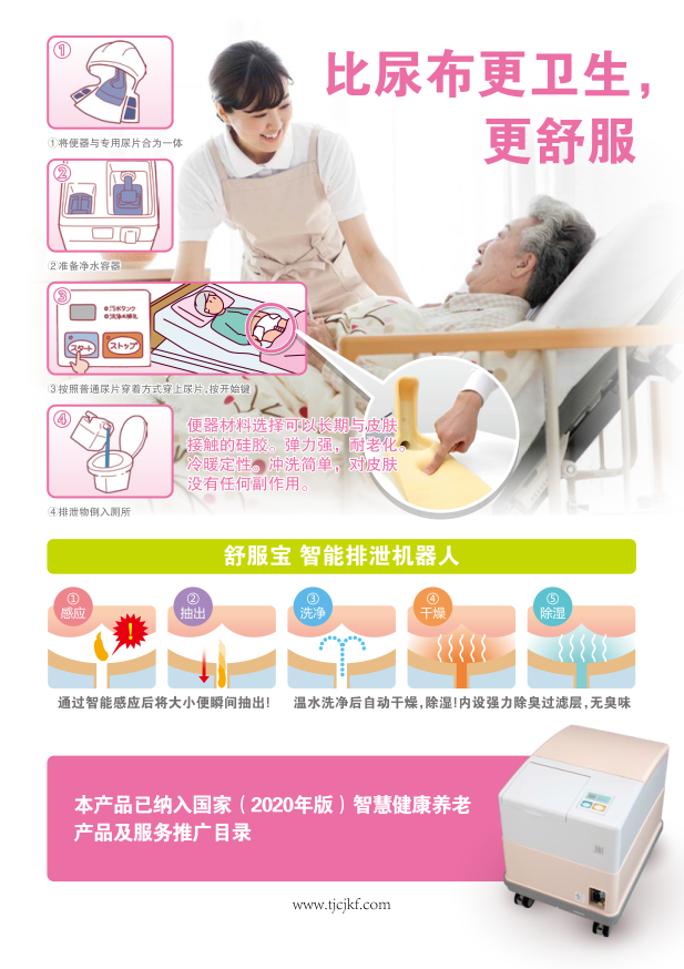 當(dāng)患者意識上有大小便排泄時,鑲嵌在臀部墊下面的感應(yīng)功能芯片,傳導(dǎo)到管理中心,電腦即時發(fā)出指令:瞬間開啟吸收功能鍵,將排泄物排泄到污物桶。 自動開啟溫水沖洗功能鍵,清洗大小便排泄處。 自動開啟干燥除濕功能鍵,將私處用微微的暖風(fēng)吹干,患者長時間的使用不會出現(xiàn)紅疹及褥瘡等現(xiàn)象。