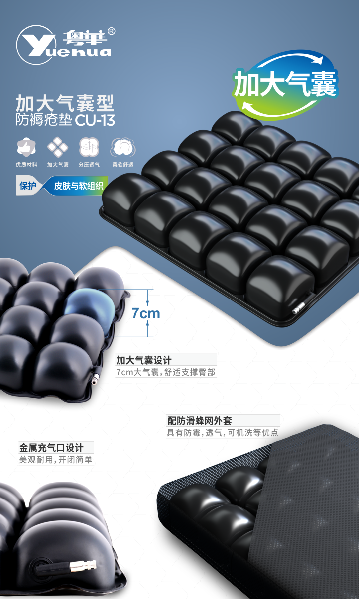 可分散臀部久坐所承受的壓力,促進(jìn)臀部干爽透氣,減輕皮膚和軟組織受到壓迫,預(yù)防和緩解壓瘡。 加大氣囊設(shè)計(jì),坐墊高度7cm,每個(gè)氣囊氣流相通,可更好承托臀部。 用于術(shù)后或長期坐臥患者,預(yù)防和緩解壓瘡。