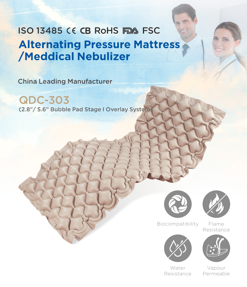 氣泡床墊采用PVC材料高頻熔接成型。借由130顆氣泡組成的充氣床墊,搭配操作簡便、外形輕巧、靜音的充氣主機,氣墊床周期性交替充泄氣,定時改變身體承壓部位,可減少臥床者身體所承受壓力的時間和大小,達到一定的減壓效果,預(yù)防和緩解褥瘡的發(fā)生。
