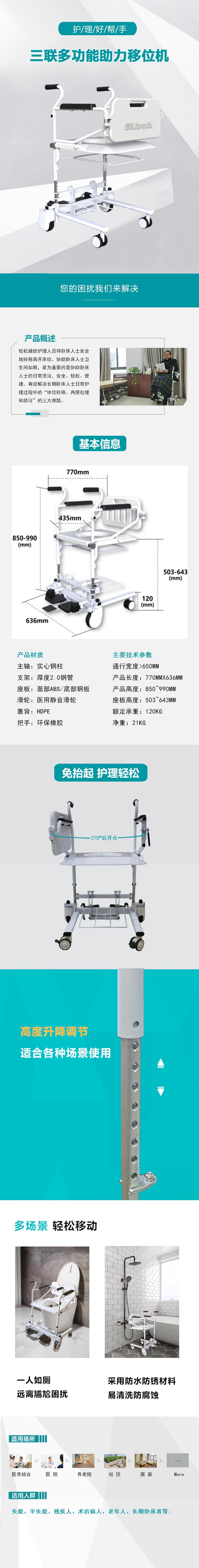 三聯(lián)多功能助力移位機,輕松的解決了照護老人、殘疾人過程中移位、如廁、助浴的三大難題。產(chǎn)品獨創(chuàng)270°后開合設(shè)計,免抬起護理更輕松;高度可升降,適合多種場景;整體采用防水防銹材料,易清洗。