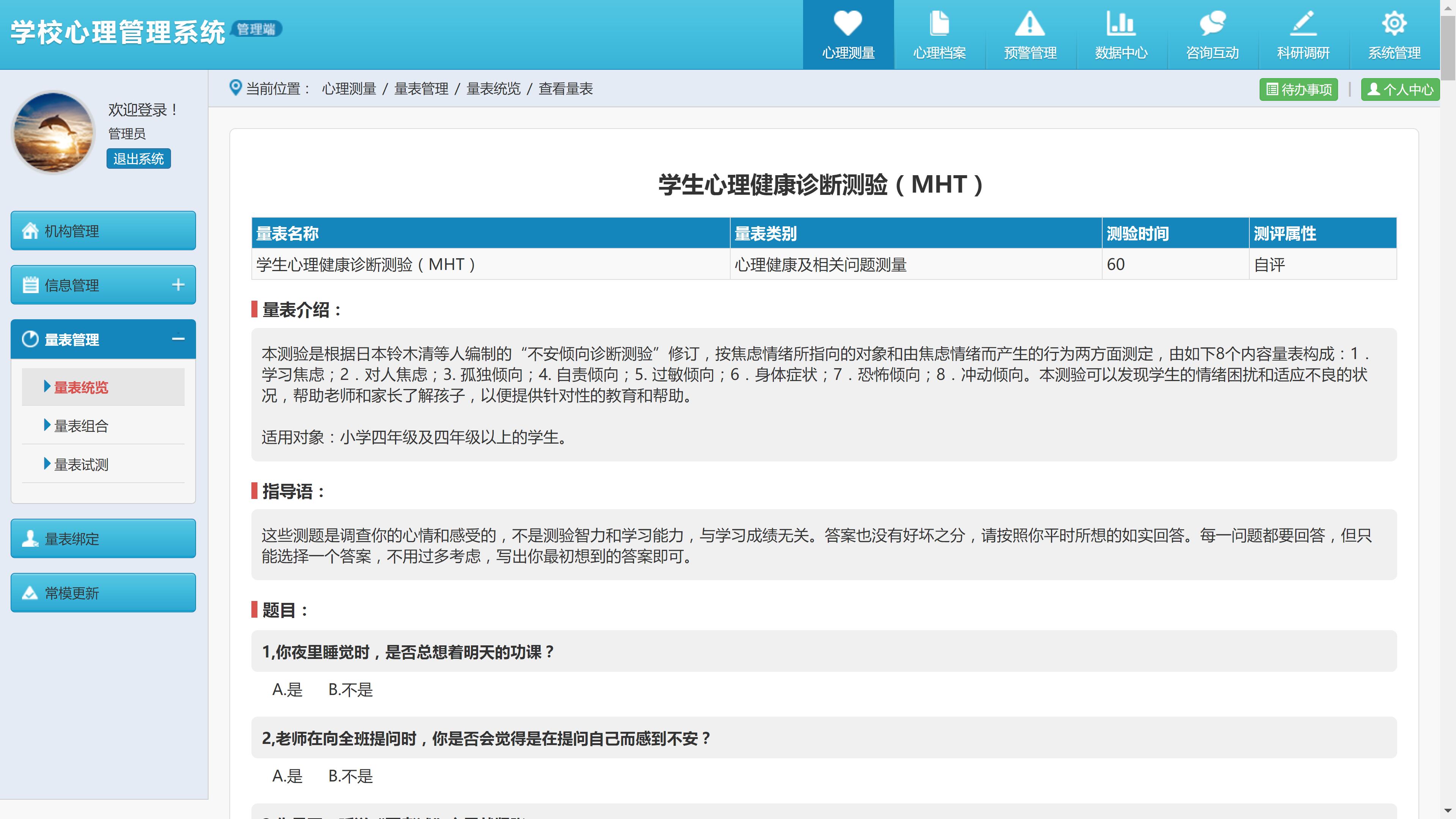 心理健康信息化綜合管理平臺(心理健康云平臺)是集學校綜合管理系統(tǒng)、心理咨詢師管理系統(tǒng)、學生測評系統(tǒng)、教師測評系統(tǒng)、家長測評系統(tǒng)等五大子系統(tǒng)于一體,將校長、心理教師、教師、學生、家長多角色進行分類管理的學校心理教育工作綜合管理平臺,五大子系統(tǒng)通過綜合的心理健康網站平臺進行集中統(tǒng)合管理。