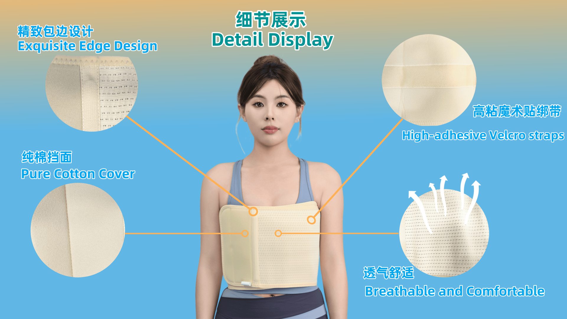 適應(yīng)癥狀: 肋骨損傷固定,胸部組織受損,骨折術(shù)后康復(fù)。 特點(diǎn): 1.加寬加長,減輕肋骨壓力。 2.加固保護(hù),防止二次受傷。 3.柔軟面料設(shè)計(jì),貼合后背支撐。 4.雙側(cè)肋骨加壓帶,減少呼吸時(shí)胸部擴(kuò)張帶來的不適。