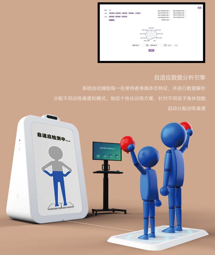 肢體協(xié)調(diào)互動訓(xùn)練系統(tǒng)采用自適應(yīng)學(xué)習(xí)引擎、數(shù)據(jù)分析引擎等核心技術(shù),對兒童的上下肢以及體態(tài)進(jìn)行全面評估與針對性訓(xùn)練。 系統(tǒng)內(nèi)置評估功能,康復(fù)師可針對每一名兒童進(jìn)行系統(tǒng)評估,例如:上下肢肌力平衡性、協(xié)調(diào)性等進(jìn)行科學(xué)的評估。大數(shù)據(jù)引擎可對評估結(jié)果進(jìn)行對比與分析,自動生成評估報(bào)告,各項(xiàng)功能指標(biāo)數(shù)據(jù)化、圖形化,一目了然,方便康復(fù)師查詢、導(dǎo)出與存檔。