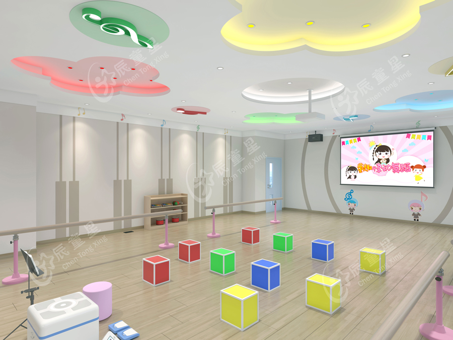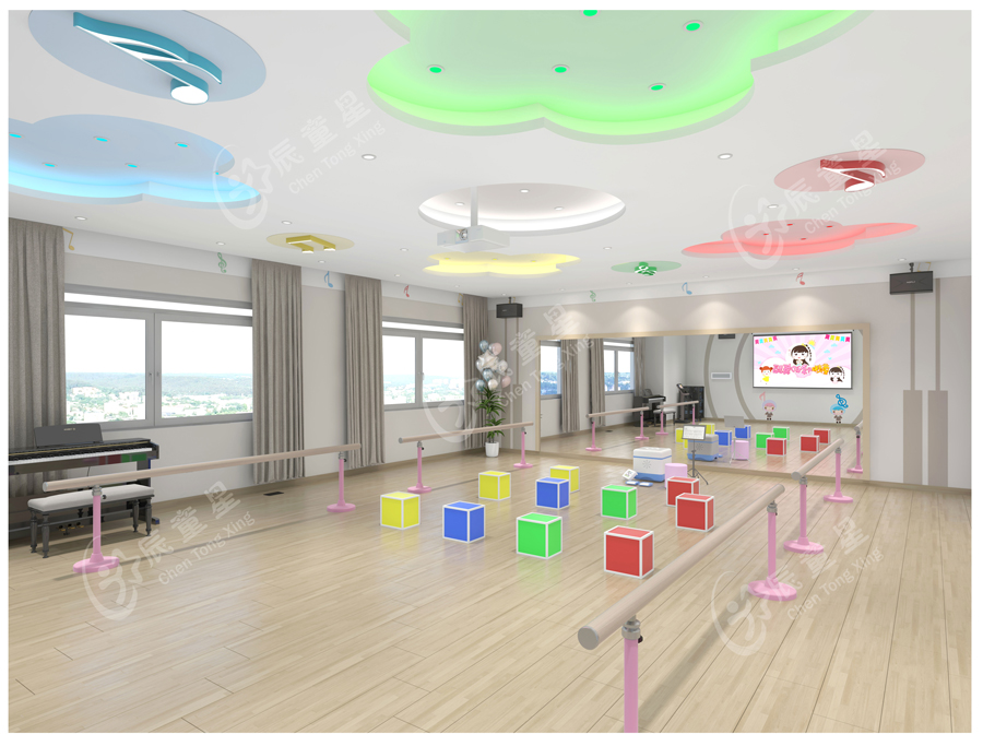 音樂律動(dòng)室是聽障、盲障、智力障礙學(xué)生進(jìn)行舞蹈、體操、游戲、音樂教學(xué)及其它藝術(shù)活動(dòng)的場所,其環(huán)境設(shè)計(jì)有利于特殊學(xué)生通過視覺和殘余聽力模仿動(dòng)作、感受舞蹈的音樂節(jié)奏。律動(dòng)教室通過訓(xùn)練學(xué)生的視、聽、觸等綜合能力,使其注意力、記憶力、感知力、結(jié)構(gòu)化能力得到加強(qiáng)。