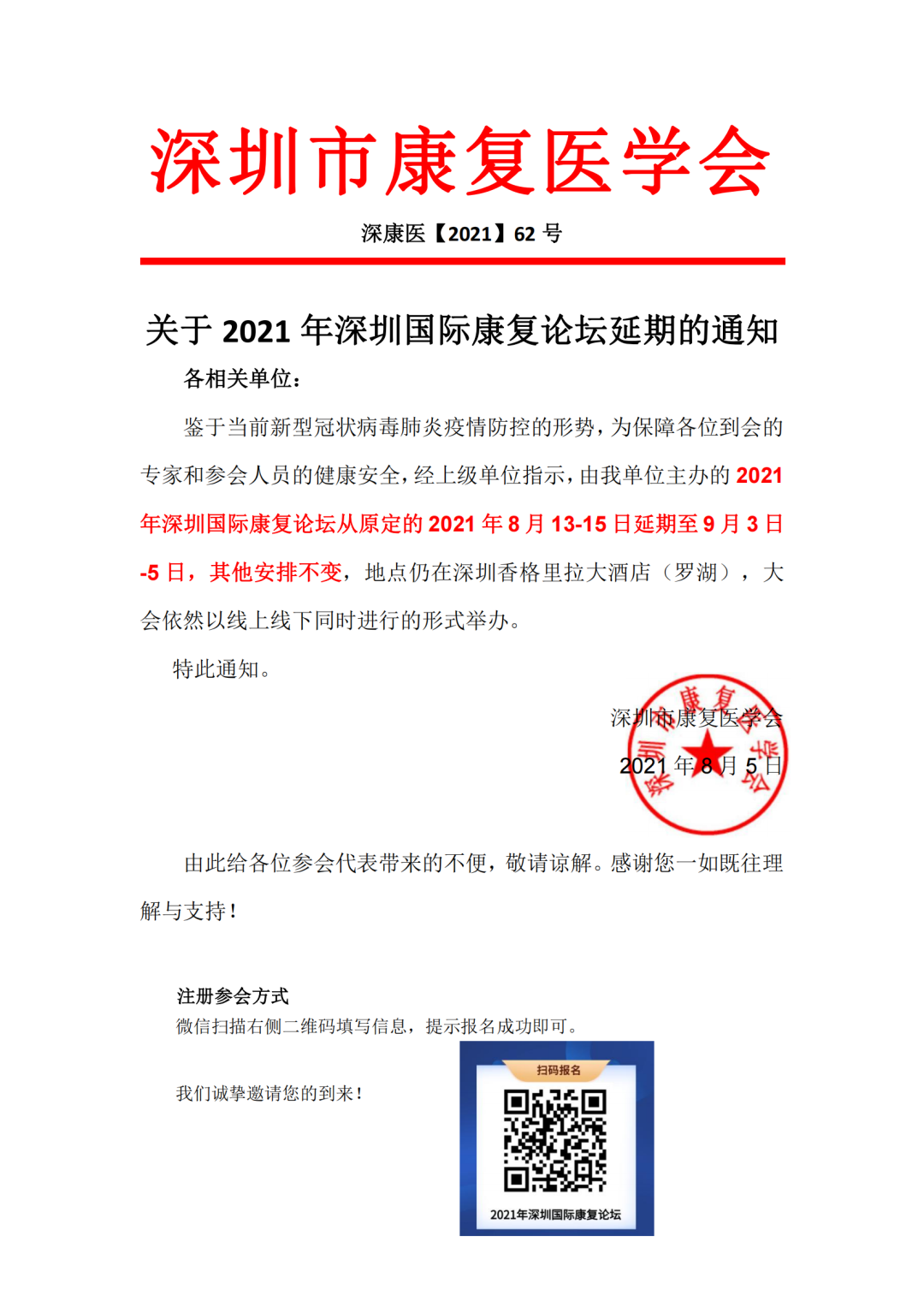 鑒于當(dāng)前新型冠狀病毒肺炎疫情防控的形勢,為保障各位到會的專家和參會人員的健康安全,經(jīng)上級單位指示,2021年深圳國際康復(fù)論壇從原定的2021年8月13-15日延期至9月3日-5日,其他安排不變,地點仍在深圳香格里拉大酒店(羅湖),大會依然以線上線下同時進(jìn)行的形式舉辦。由此給各位參會代表帶來的不便,敬請諒解。