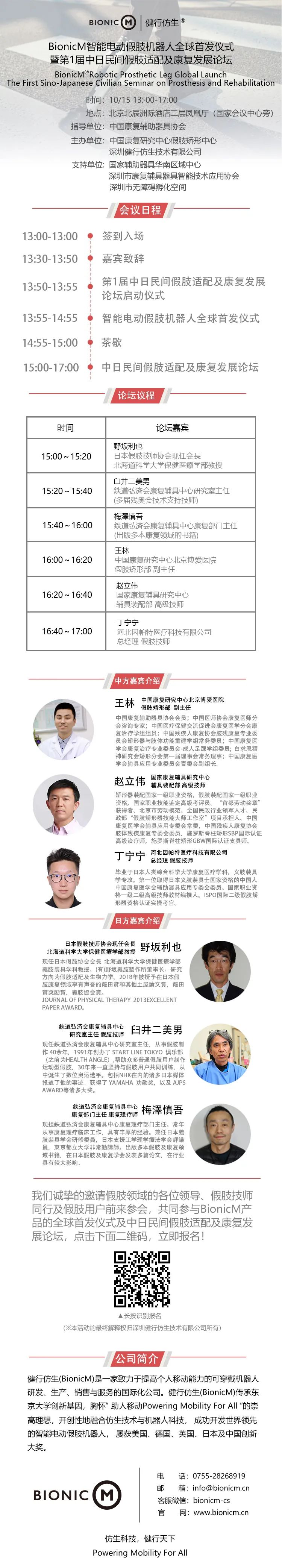 值此喜慶之際,BionicM(健行仿生)將參展2021中國(guó)國(guó)際福祉博覽會(huì),智能電動(dòng)假肢機(jī)器人全球首次正式發(fā)布,同時(shí),BionicM將與福祉博覽會(huì)同期舉辦中日第1屆民間假肢適配及康復(fù)發(fā)展論壇,通過(guò)中日兩國(guó)假肢及康復(fù)領(lǐng)域權(quán)威專(zhuān)家之間的對(duì)話(huà)、交流、信息共享,促進(jìn)兩個(gè)國(guó)家在假肢及康復(fù)領(lǐng)域的交流和合作。我們真誠(chéng)邀請(qǐng)您一起見(jiàn)證全球首發(fā)的智造之光、及首屆中日民間假肢適配與康復(fù)發(fā)展的論壇盛舉!