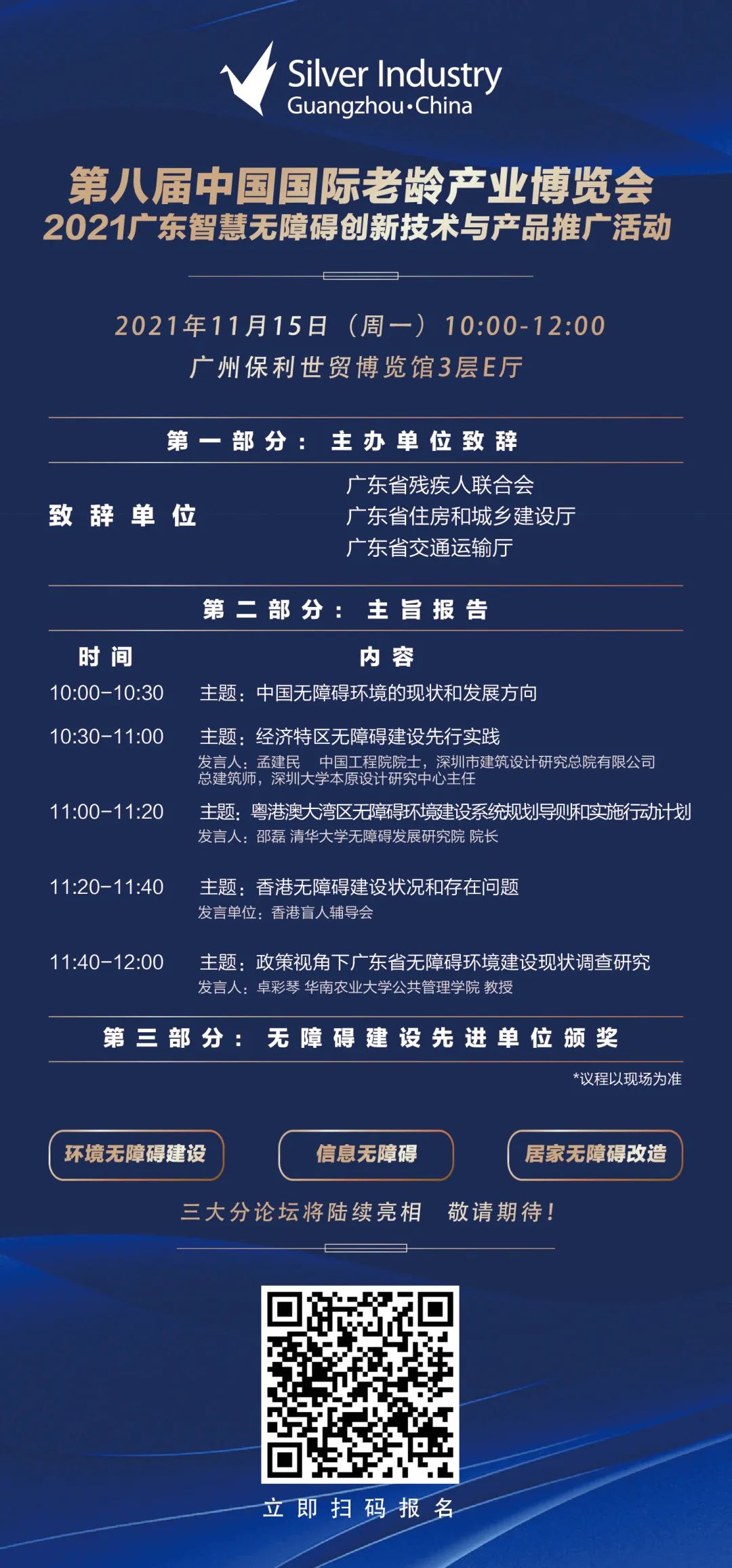 展會(huì)同期舉辦“2021 廣東智慧無障礙創(chuàng)新技術(shù)與產(chǎn)品推廣活動(dòng)”,環(huán)境無障礙建設(shè)、信息無障礙、居家無障礙改造三大分論壇將陸續(xù)亮相,歡迎報(bào)名參會(huì),詳情如下: