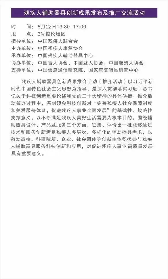 2023中國國際福祉博覽會暨中國國際康復博覽會以“面向下一個百年:創(chuàng)新賦能、合作共贏、增進福祉”為主題,將于5月21日-23日在北京首鋼會展中心舉辦。本屆福祉博覽會將集中展示殘疾人、老年人用輔助器具、康復醫(yī)療等領域的新產品、新技術、新應用,同期舉辦30余場專業(yè)論壇、采購對接等交流活動。