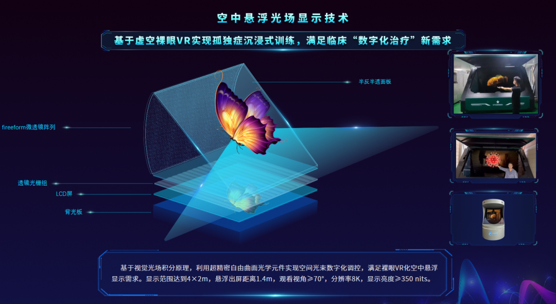 基于視覺光場積分原理,利用超精密自由曲面光學(xué)元件實現(xiàn)空間光束數(shù)字化調(diào)控,滿足裸眼VR化空中懸浮顯示需求。最大顯示范圍達到4×2m,最大懸浮出屏距離1.4m,觀看視角≥70°,顯示亮度≥350 nits。系統(tǒng)可通過采集用戶語音、姿態(tài)、手勢、眼神、面部表情等多模態(tài)行為學(xué)特征實現(xiàn)沉浸式、非接觸的隔空人機交互訓(xùn)練,滿足臨床“數(shù)字化治療”新需求。為當前國內(nèi)最大顯示范圍、出屏距離裸眼VR系統(tǒng)。