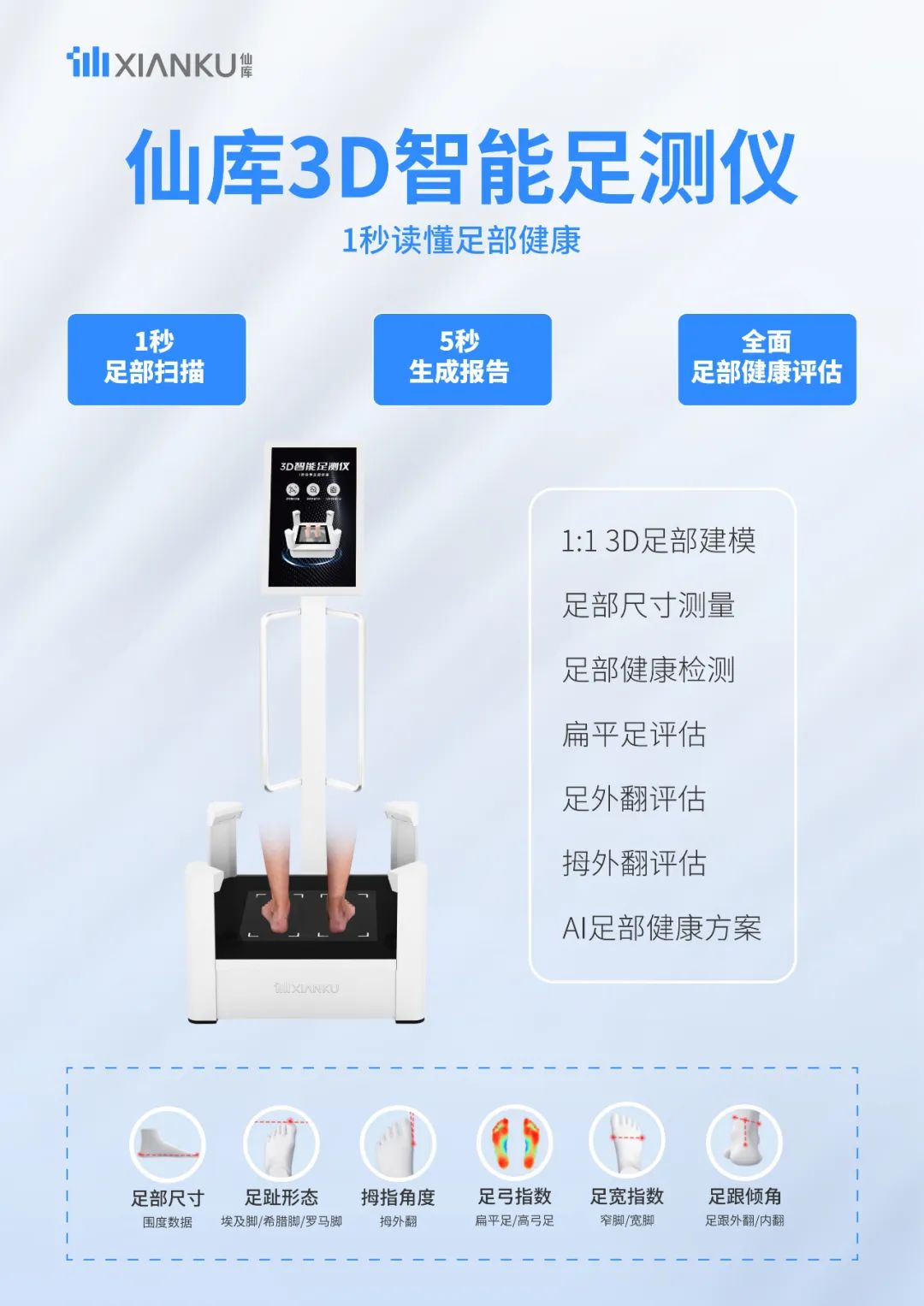 仙庫(kù)3D智能足測(cè)儀B002通過(guò)3D結(jié)構(gòu)光掃描技術(shù),只需要1秒鐘,即可完成足部3D建模測(cè)量及腳型分析,評(píng)估扁平足、高足弓、足跟側(cè)翻、拇外翻等足部健康風(fēng)險(xiǎn),輸出包含足部尺寸、足類(lèi)型、足趾形態(tài)、足底分析、足跟傾角等多項(xiàng)專(zhuān)業(yè)數(shù)據(jù)的3D足部健康報(bào)告,可實(shí)現(xiàn)智能推薦鞋碼款式、定制健康足弓鞋墊、足部健康方案制定等足部健康應(yīng)用??蓮V泛適用于醫(yī)療康復(fù)、運(yùn)動(dòng)健身、鞋業(yè)門(mén)店等場(chǎng)景。