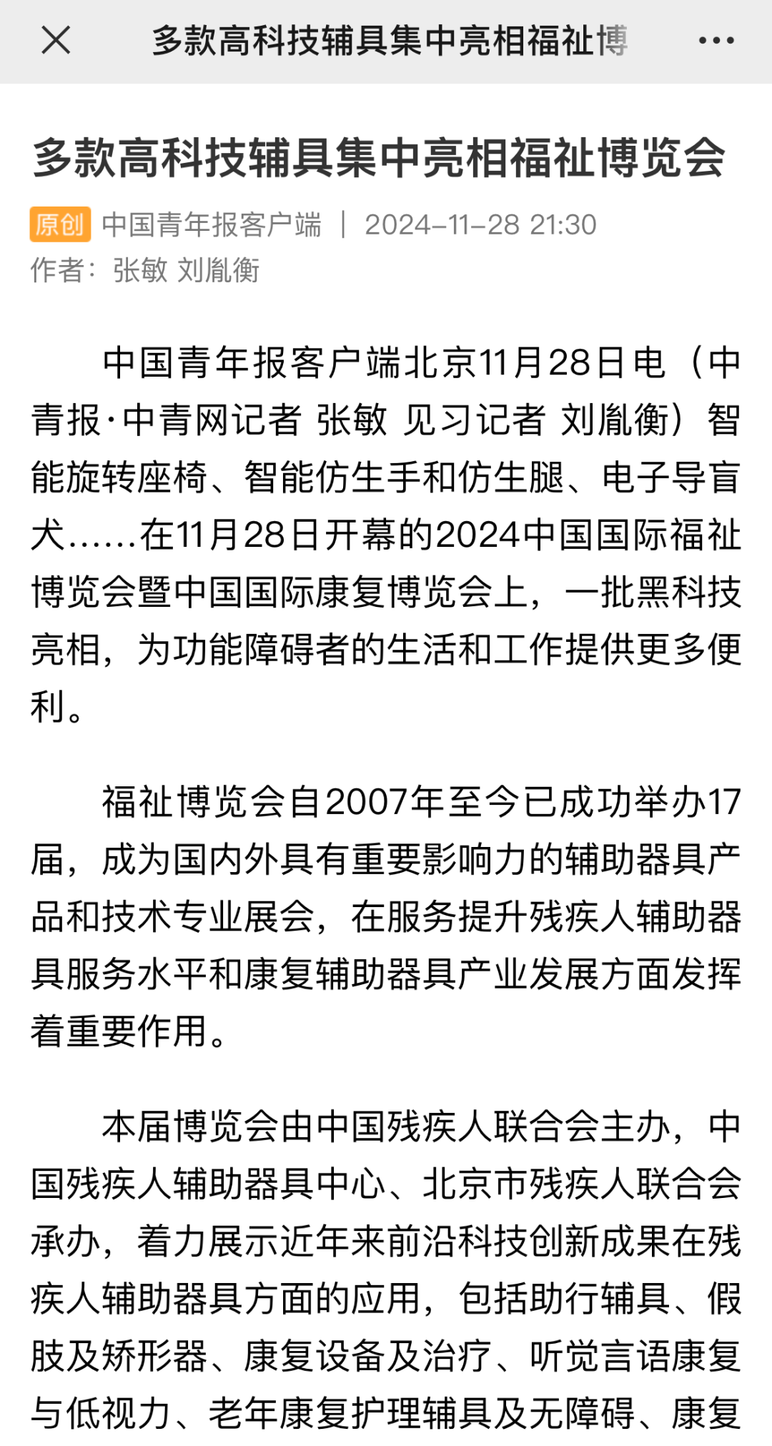 展會(huì)展示各類產(chǎn)品萬(wàn)余件,包括外骨骼機(jī)器人、智能康復(fù)訓(xùn)練系統(tǒng)、能幫助聽(tīng)障者無(wú)障礙交流的多語(yǔ)種AI透明屏、能幫助言語(yǔ)障礙者修復(fù)聲音的APP等一系列創(chuàng)新產(chǎn)品,涵蓋殘疾人、老年人出行、生活、醫(yī)療、娛樂(lè)等多個(gè)領(lǐng)域。