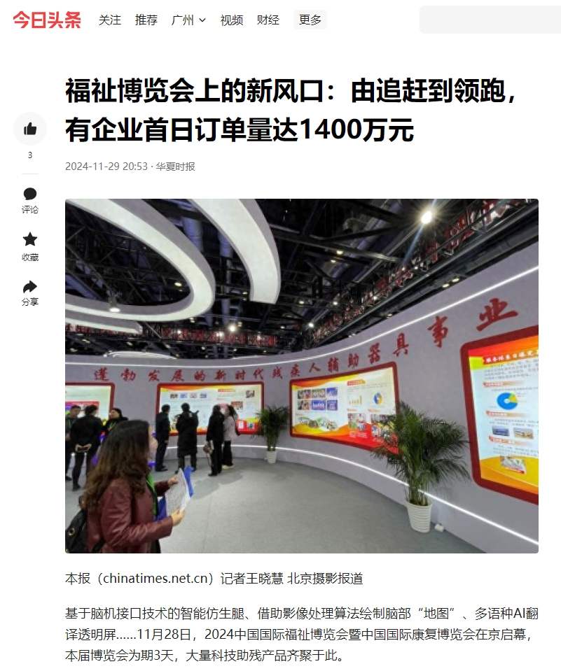 基于腦機(jī)接口技術(shù)的智能仿生腿、借助影像處理算法繪制腦部“地圖”、多語種AI翻譯透明屏……11月28日,2024中國國際福祉博覽會暨中國國際康復(fù)博覽會在京啟幕,本屆博覽會為期3天,大量科技助殘產(chǎn)品齊聚于此。