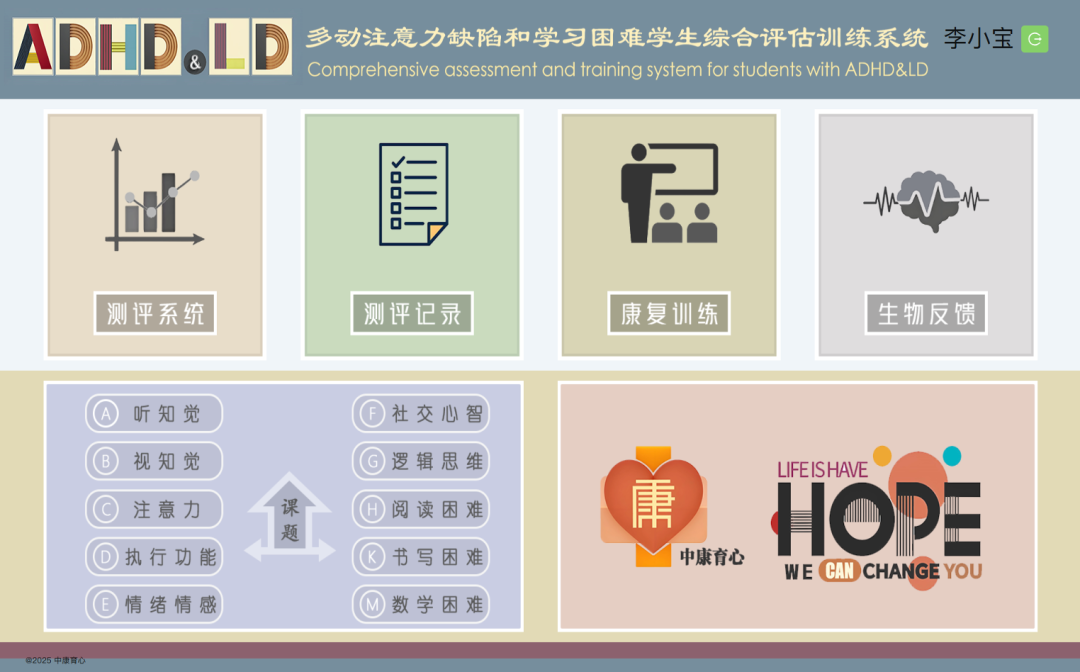 中康育心多動(dòng)注意力缺陷及學(xué)習(xí)困難評(píng)估訓(xùn)練系統(tǒng),由數(shù)字康復(fù)管理平臺(tái)(醫(yī)療級(jí)推車)及多臺(tái)康復(fù)終端設(shè)備組成,適用于多動(dòng)注意力缺陷及學(xué)習(xí)困難患者的數(shù)字化評(píng)估、能力測試和康復(fù)治療。本系統(tǒng)能有效提升醫(yī)生和康復(fù)師在專業(yè)評(píng)估、制定個(gè)別化教育計(jì)劃(IEP)、康復(fù)課題訓(xùn)練、數(shù)據(jù)記錄與總結(jié)等環(huán)節(jié)中的效率、準(zhǔn)確性與專業(yè)度。該系統(tǒng)通過智能算法確保評(píng)估與訓(xùn)練的標(biāo)準(zhǔn)化,提高了患者訓(xùn)練的標(biāo)準(zhǔn)化程度、準(zhǔn)確度與干預(yù)效率。多動(dòng)及學(xué)習(xí)困難評(píng)估與訓(xùn)練系統(tǒng)本系統(tǒng)將傳統(tǒng)評(píng)估量表、神經(jīng)心理專項(xiàng)能力測驗(yàn)及生理信號(hào)(眼動(dòng))相結(jié)合,為患者提供智能化、精準(zhǔn)化的評(píng)估和康復(fù)服務(wù),支持院內(nèi)康復(fù)、教學(xué)指導(dǎo)、醫(yī)療診治輔助。