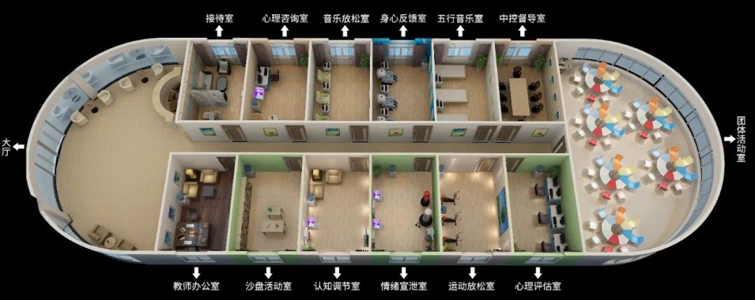 3、通用性。心理咨詢室應(yīng)面向全體學(xué)生,通過普遍開展團(tuán)體輔導(dǎo)活動(dòng),使學(xué)生對(duì)心理健康有積極認(rèn)識(shí),使心理素質(zhì)逐步得到提高。其建設(shè)應(yīng)通透流暢,適合開展團(tuán)體活動(dòng)。