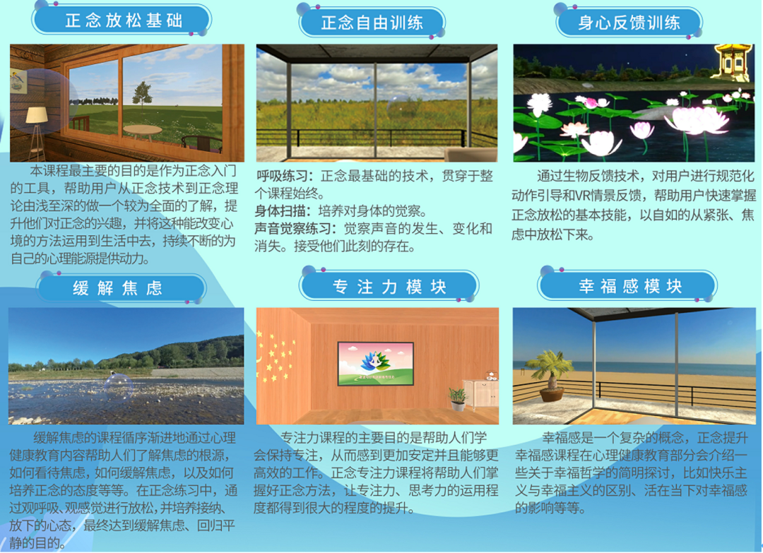 2、 正念基本技術(shù)自由訓(xùn)練模塊6分鐘呼吸空間、12分鐘呼吸空間、18分鐘呼吸空間、聲音覺察、軀體掃描。包含:草原、湖邊、雪山、海邊 、沙漠、天空、 樹林、星空、高山等場景。
