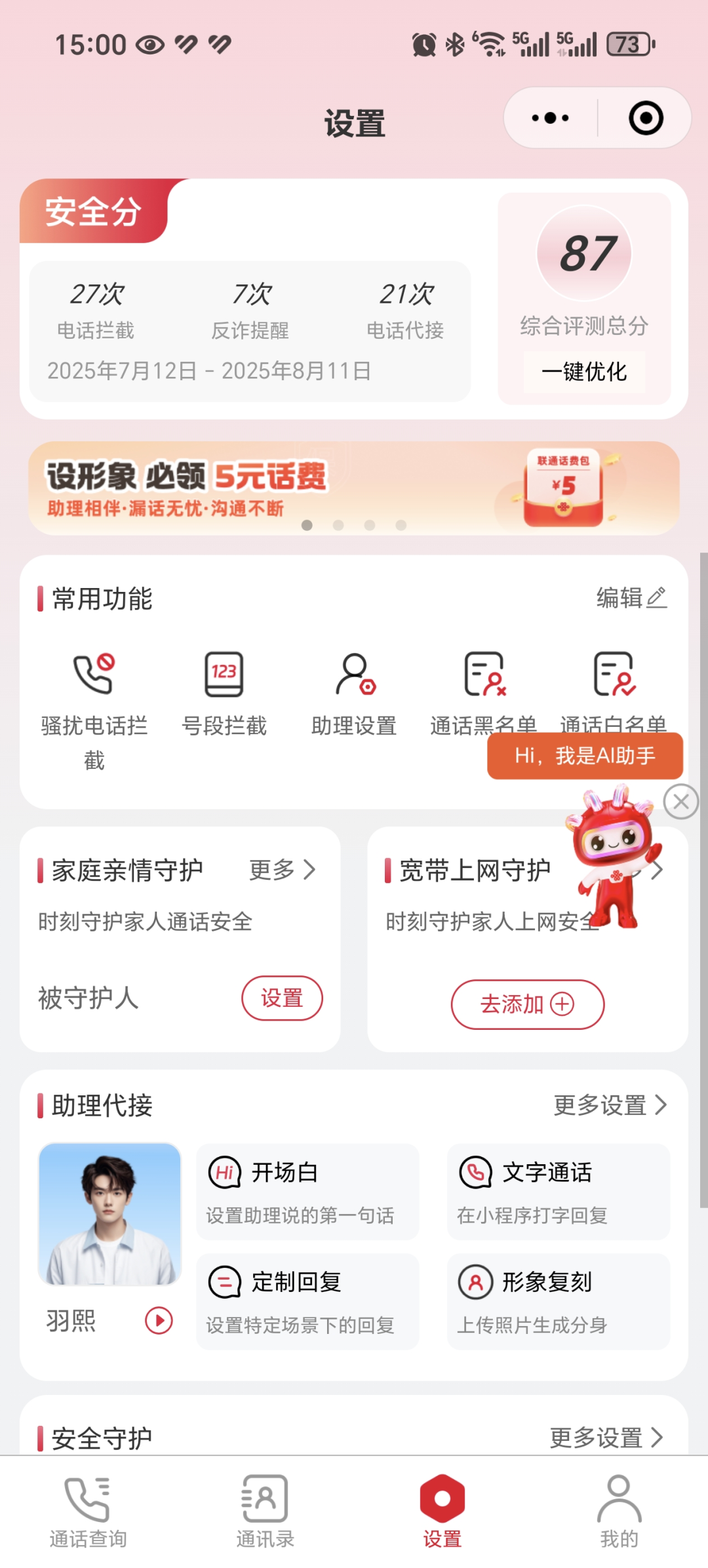 通信安全管家是圍繞通話安全、短信安全、親情守護(hù)、手機(jī)上網(wǎng)守護(hù)、寬帶上網(wǎng)守護(hù)五大場(chǎng)景打造的一款集涉詐識(shí)別、智能處置于一體的防詐騙、防騷擾產(chǎn)品,旨在為用戶提供一個(gè)更加安全、智能的通信環(huán)境。