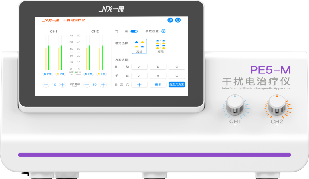 便攜式干擾電治療儀PE5-M是在傳統(tǒng)干擾電療法和動態(tài)干擾電療法的基礎(chǔ)上進一步發(fā)展起來,在體內(nèi)形成的低頻干擾內(nèi)生電流,可以抑制感覺神經(jīng),同時促使毛細血管與動脈擴張,局部血液循環(huán)的改變有利于炎癥滲出液,水腫的吸收等作用。干擾產(chǎn)生的低頻差,利用中頻電流比低頻電流更高的穿透性,透入人體組織的深層。