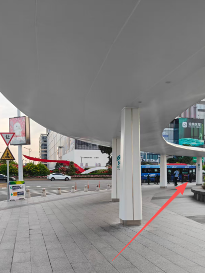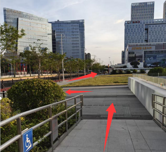 若乘到對(duì)向公交車站,輪椅人士請(qǐng)前往琶洲地鐵站A口,使用地鐵升降機(jī),通過地下通道,再從地鐵琶洲站C口出路面,與前文圖示路線一致。
