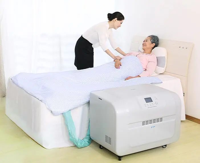 2019福祉博覽會現(xiàn)場洗澡演示:臥床人平躺在床上不用搬動,通過給洗澡床充氣即可淋浴洗澡。