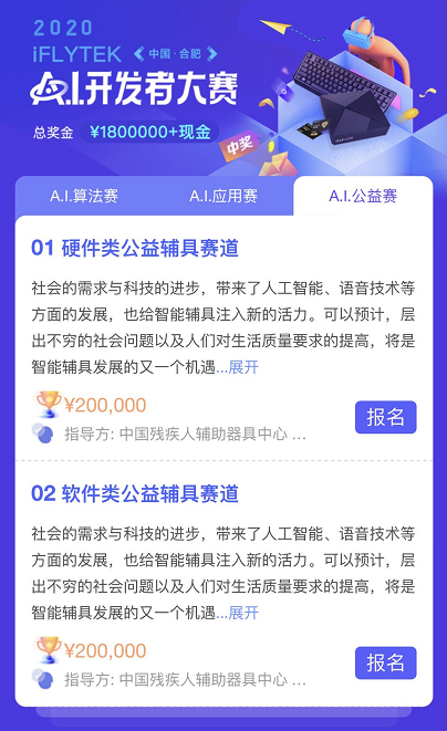 今年,在中國殘疾人輔助器具中心、中國聾人協(xié)會指導(dǎo),中國國際福祉博覽會暨中國國際康復(fù)博覽會組委會、深圳市信息無障礙研究會等多家單位聯(lián)合支持下,科大訊飛推出了A.I.公益賽,包含軟件類智能輔具賽題及硬件類智能輔具賽題。