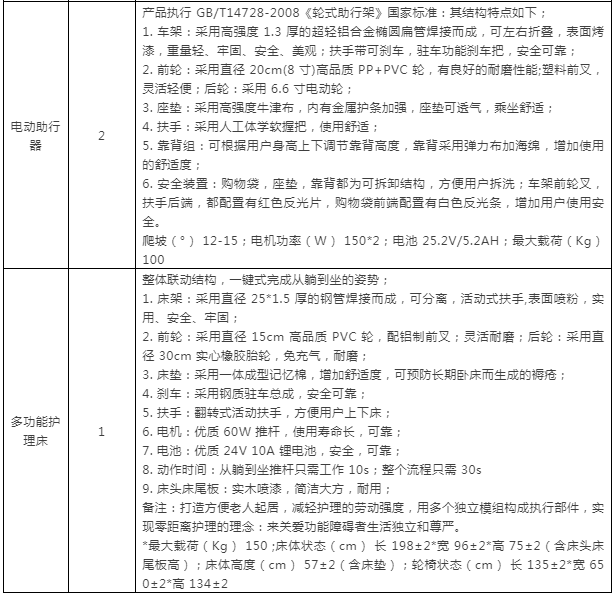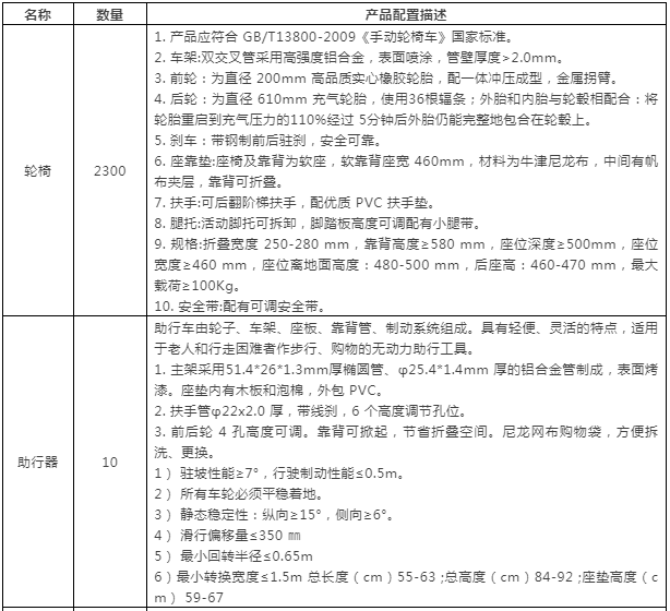 采購(gòu)產(chǎn)品及數(shù)量:輪椅2300輛;助行器10個(gè);電動(dòng)助行器2個(gè);多功能護(hù)理床1張。