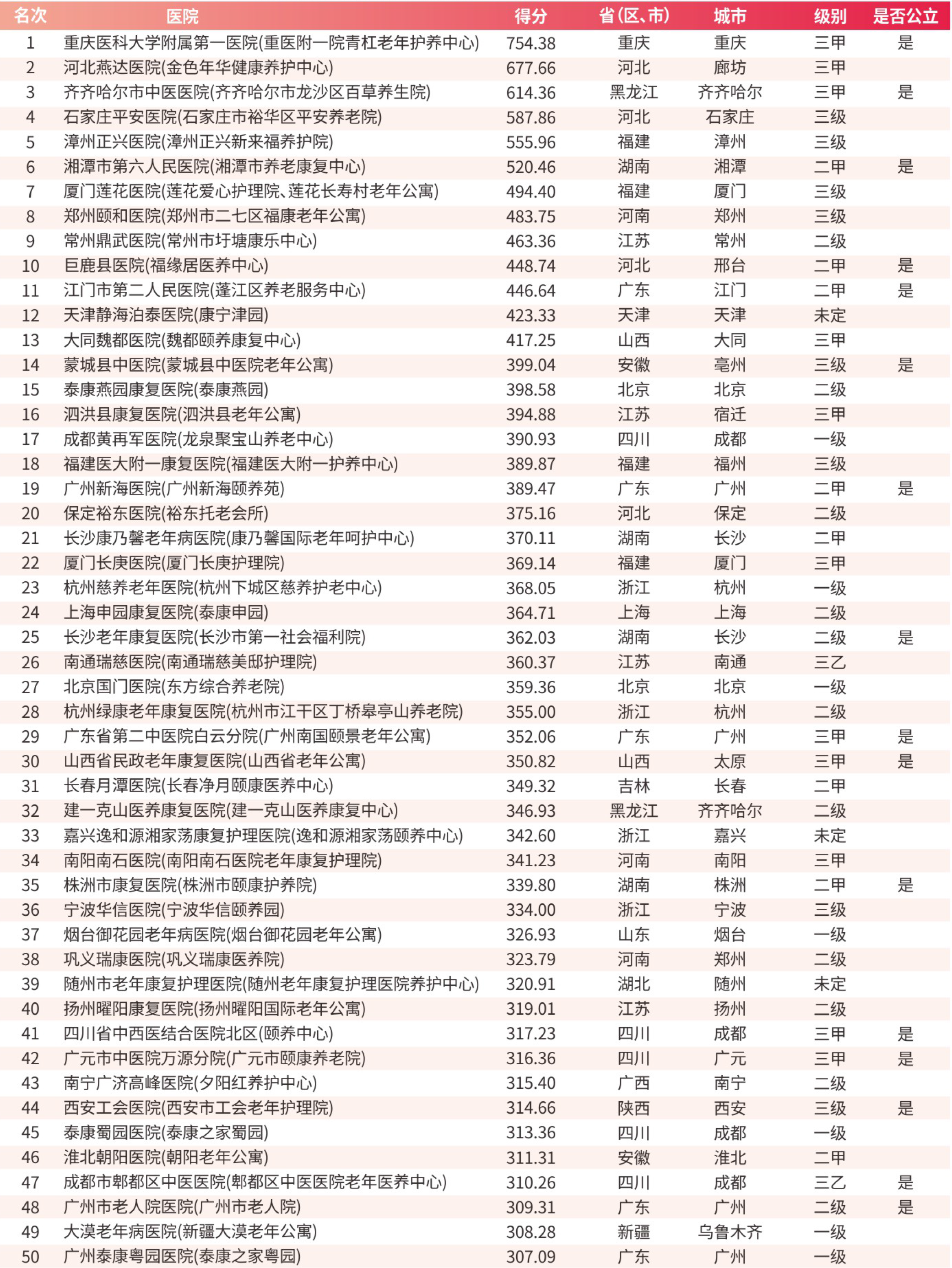 近年來,為應(yīng)對(duì)老齡化、慢病高發(fā)的態(tài)勢(shì),我國(guó)制定和推出有關(guān)政策,鼓勵(lì)社會(huì)辦醫(yī)、推動(dòng)醫(yī)養(yǎng)結(jié)合和康復(fù)醫(yī)療的發(fā)展。日前,《中國(guó)醫(yī)院競(jìng)爭(zhēng)力報(bào)告(2019~2020)》發(fā)布,其中包括2019康復(fù)醫(yī)院50強(qiáng)和醫(yī)養(yǎng)結(jié)合機(jī)構(gòu)100強(qiáng)。一起來看看都有哪些醫(yī)院和機(jī)構(gòu)上榜了: