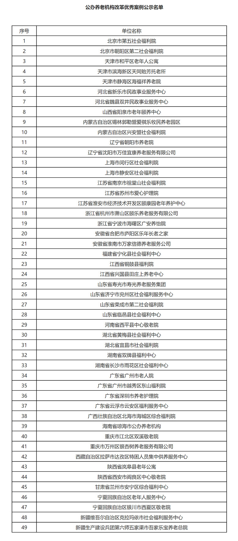 根據(jù)《民政部辦公廳國家發(fā)展改革委辦公廳關(guān)于開展公辦養(yǎng)老機(jī)構(gòu)改革試點工作總結(jié)推廣公辦養(yǎng)老機(jī)構(gòu)改革典型經(jīng)驗的通知》(民辦函〔2020〕57號)要求,民政部養(yǎng)老服務(wù)司、國家發(fā)展改革委社會發(fā)展司開展了公辦養(yǎng)老機(jī)構(gòu)改革典型經(jīng)驗收集及遴選工作,按照地方推薦、專家評審、部門聯(lián)審等程序,遴選出了北京市第五社會福利院等49家公辦養(yǎng)老機(jī)構(gòu)改革優(yōu)秀案例,現(xiàn)予公示。