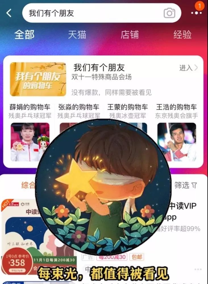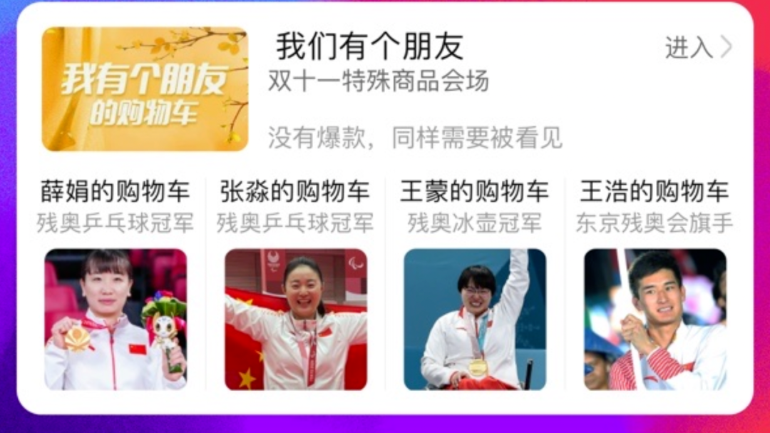 這個(gè)“隱藏會(huì)場(chǎng)”還能看到薛娟、張淼、王蒙和王浩這4位殘奧會(huì)冠軍分享的雙11購(gòu)物車。