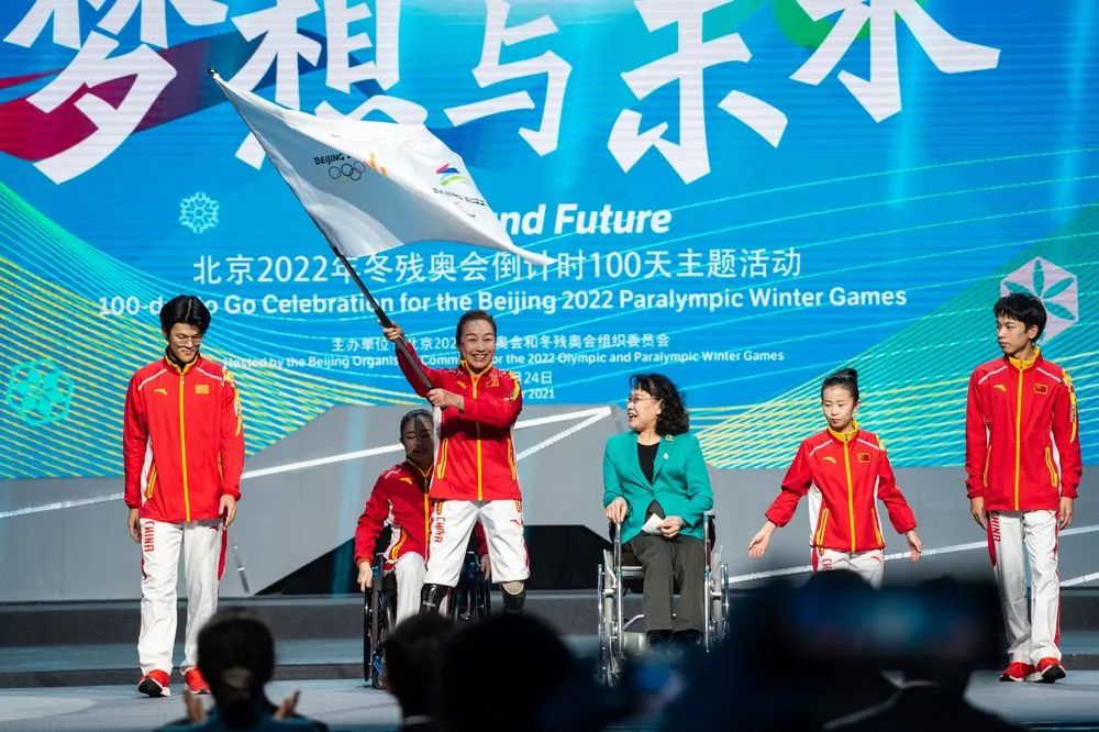 11月24日,北京2022年冬殘奧會(huì)倒計(jì)時(shí)100天主題活動(dòng)在北京舉行,中國(guó)殘聯(lián)主席張海迪(右三)為冬奧會(huì)和冬殘奧會(huì)賽會(huì)志愿者中的殘疾人代表授旗。新華社記者 陳鐘昊 攝