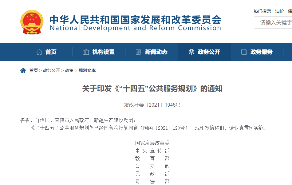 1月10日,國家發(fā)展和改革委員會(huì)發(fā)布關(guān)于《“十四五”公共服務(wù)規(guī)劃》的通知,此規(guī)劃依據(jù)《中華人民共和國國民經(jīng)濟(jì)和社會(huì)發(fā)展第十四個(gè)五年規(guī)劃綱要》編制,主要涵蓋幼有所育、學(xué)有所教、勞有所得、病有所醫(yī)、老有所養(yǎng)、住有所居、弱有所扶、優(yōu)軍服務(wù)保障和文體服務(wù)保障等領(lǐng)域的公共服務(wù)。