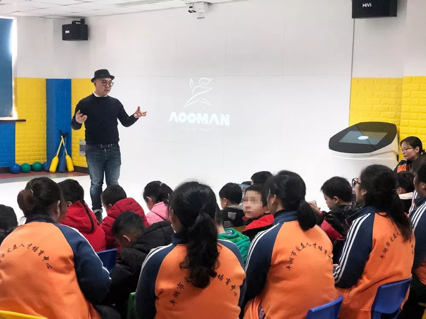 (奧漫優(yōu)悅智能多媒體教育基地落成,李峘與李羿丹與孩子們互動(dòng))