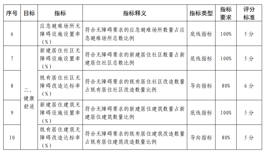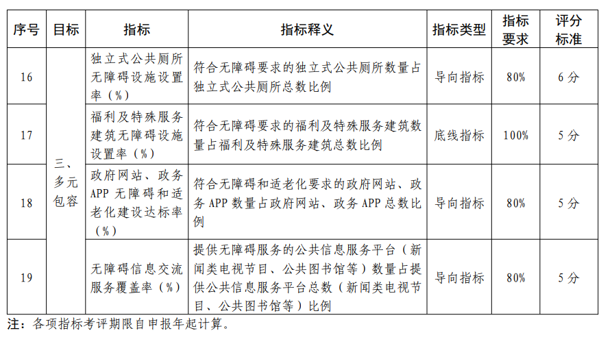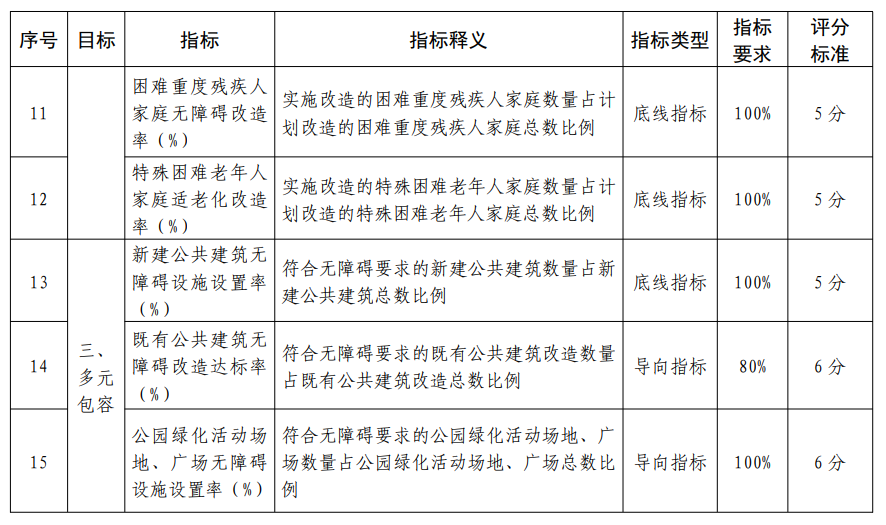 ?。ㄒ唬φ铡秳?chuàng)建全國無障礙建設示范城市(縣)考評標準》,提出創(chuàng)建目標、制定創(chuàng)建工作方案,編制無障礙環(huán)境建設發(fā)展規(guī)劃,制定無障礙設施建設和改造計劃,在創(chuàng)建周期內能夠達到相應要求;