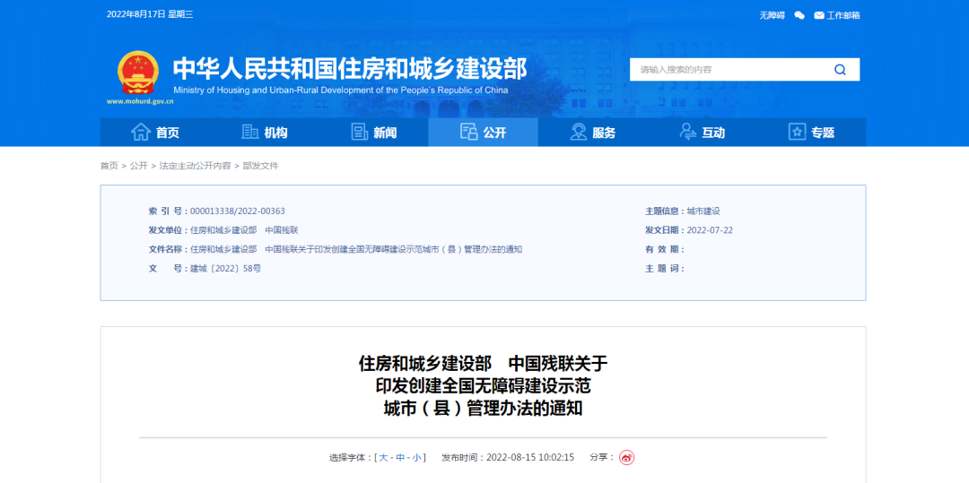 創(chuàng)建全國無障礙建設示范城市(縣)建議名單在住房和城鄉(xiāng)建設部門戶網站公示,公示期為10個工作日。公示無異議的,由住房和城鄉(xiāng)建設部、中國殘聯(lián)正式命名。