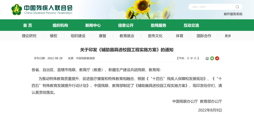 為推動特殊教育質(zhì)量提升,促進(jìn)醫(yī)療康復(fù)和特殊教育相融合,根據(jù)《“十四五”殘疾人保障和發(fā)展規(guī)劃》、《“十四五”特殊教育發(fā)展提升行動計劃》,中國殘聯(lián)、教育部制定了《輔助器具進(jìn)校園工程實施方案》,現(xiàn)印發(fā)給你們,請認(rèn)真貫徹落實。