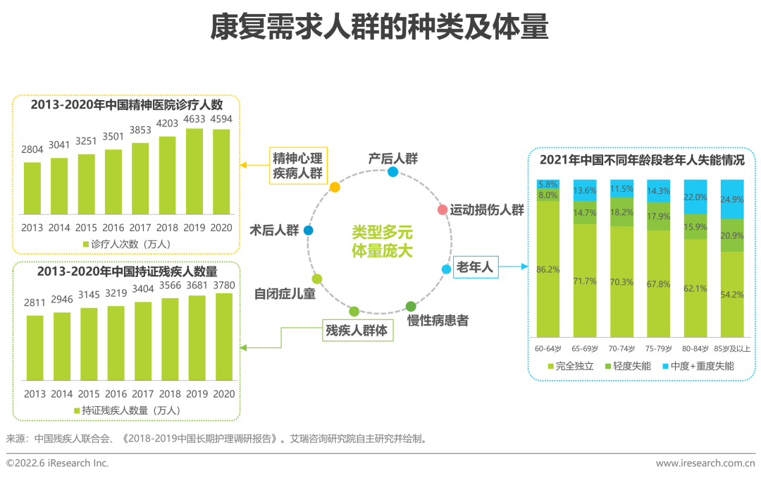由于人口老齡化加劇及百姓健康消費(fèi)需求升級(jí)等多重原因,康復(fù)醫(yī)療正迎來(lái)重要發(fā)展機(jī)遇期,康復(fù)醫(yī)療需求群體不斷擴(kuò)大。根據(jù)《柳葉刀》研究統(tǒng)計(jì),我國(guó)為全球康復(fù)需求最大的國(guó)家,2019年康復(fù)需求總?cè)藬?shù)達(dá)到4.6億人。從當(dāng)下康復(fù)患者畫像來(lái)看,包含老年人、慢性病患者、殘疾人群體、術(shù)后人群、自閉癥兒童等。艾瑞認(rèn)為,隨著患者康復(fù)意識(shí)的覺(jué)醒,整體康復(fù)需求正在從傳統(tǒng)型向消費(fèi)型逐漸轉(zhuǎn)變,產(chǎn)后康復(fù)、運(yùn)動(dòng)康復(fù)、精神及心理康復(fù)將受到更廣泛的關(guān)注。