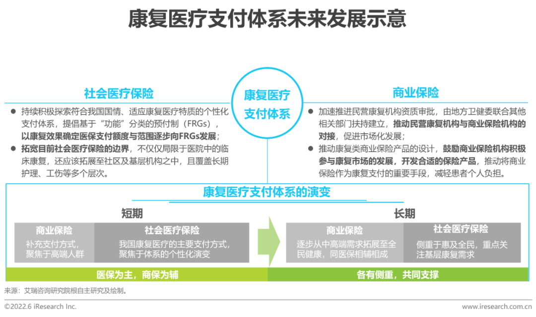 隨著我國(guó)康復(fù)醫(yī)療整體市場(chǎng)的擴(kuò)增及高速發(fā)展,康復(fù)醫(yī)療支付體系也會(huì)愈加完善。其中,社會(huì)醫(yī)療保險(xiǎn)支付將按照醫(yī)療的價(jià)值付費(fèi),“遏制無(wú)效醫(yī)療,支持有效醫(yī)療”,逐漸走向基于“功能”分類的預(yù)付制(FRGs) ,商業(yè)保險(xiǎn)則會(huì)在相關(guān)部門的助推及市場(chǎng)刺激之下逐步納入我國(guó)康復(fù)醫(yī)療支付體系。短期內(nèi),二者將保持以“醫(yī)保為主,商保為輔”的模式,分別適用于基層群眾以及高端人群,而后隨著商保近年來(lái)致力于打造大健康支付、健康閉環(huán),商業(yè)保險(xiǎn)機(jī)構(gòu)將從服務(wù)用戶全生命周期視角出發(fā),關(guān)注康復(fù)醫(yī)療項(xiàng)目,逐漸形成醫(yī)保、商保雖各有側(cè)重,但相輔相成的康復(fù)醫(yī)療支付體系。