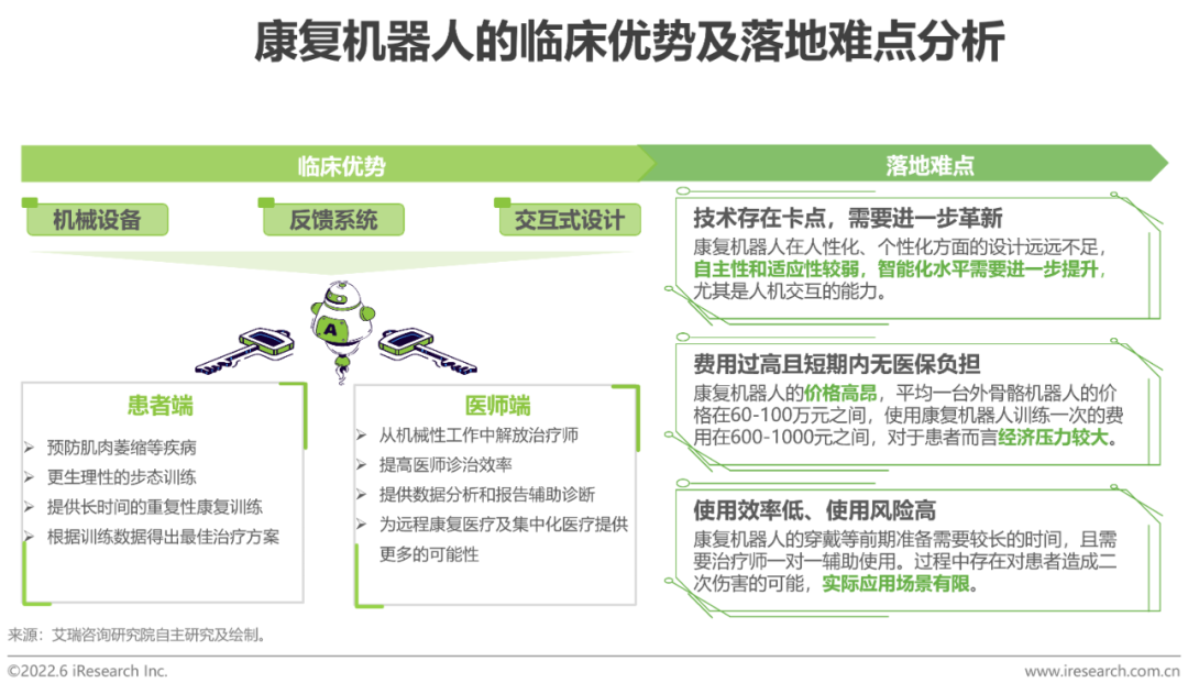 康復(fù)機(jī)器人是近年來(lái)備受市場(chǎng)關(guān)注的高端康復(fù)醫(yī)療器械,屬于機(jī)器人技術(shù)與醫(yī)療技術(shù)結(jié)合的產(chǎn)物,被認(rèn)為是特殊環(huán)境下的“可穿戴設(shè)備”,具備助殘行走、康復(fù)治療、減輕勞動(dòng)強(qiáng)度等功能,能夠幫助殘疾患者重新恢復(fù)運(yùn)動(dòng)能力,帶來(lái)回歸社會(huì)的希望,也能夠進(jìn)一步減輕康復(fù)醫(yī)師的工作負(fù)擔(dān)。但作為一個(gè)新興賽道,康復(fù)機(jī)器人的發(fā)展同時(shí)也面臨著諸多落地性商業(yè)化難點(diǎn),目前的技術(shù)尚難以支撐康復(fù)機(jī)器人的理想化運(yùn)作,其使用效率較低且風(fēng)險(xiǎn)高,同時(shí)康復(fù)機(jī)器人的使用費(fèi)用高昂且短期內(nèi)無(wú)法納入醫(yī)保支付體系,對(duì)于患者而言,整體性價(jià)比較低。