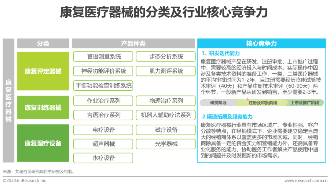 目前按照國(guó)際標(biāo)準(zhǔn)IS09999,康復(fù)器械產(chǎn)品可分為130個(gè)次類和781個(gè)支類,呈現(xiàn)種類繁多的特點(diǎn)。但下游客戶和需求較為分散,導(dǎo)致行業(yè)集中度較低,尚未形成規(guī)?;凝堫^企業(yè),但行業(yè)規(guī)模效應(yīng)的實(shí)現(xiàn)需要長(zhǎng)時(shí)間的積累,對(duì)于企業(yè)而言存在一定的機(jī)遇點(diǎn)。市場(chǎng)對(duì)于康復(fù)醫(yī)療器械產(chǎn)品的需求日益旺盛且呈現(xiàn)多樣化,然而一項(xiàng)產(chǎn)品從研發(fā)到上市推廣至少需要2-3年,在這樣的行業(yè)特點(diǎn)和發(fā)展趨勢(shì)下,擁有優(yōu)異研發(fā)迭代能力的企業(yè)更具備優(yōu)勢(shì);從銷售方面而言,康復(fù)醫(yī)療器械的客戶較為分散且行業(yè)專業(yè)性較強(qiáng),這要求企業(yè)具備緊貼行業(yè)需求的渠道營(yíng)銷和服務(wù)能力以打通市場(chǎng)。