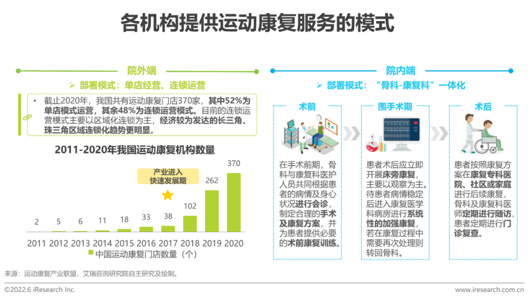 隨著人們健康意識(shí)的提升,全民健身運(yùn)動(dòng)已成為一種新潮流,但隨之而來(lái)的是人們?cè)隗w育鍛煉中而引發(fā)的各種運(yùn)動(dòng)損傷。根據(jù)《中國(guó)衛(wèi)生健康統(tǒng)計(jì)年鑒》顯示,2021年中國(guó)因骨科疾病住院接受手術(shù)治療的患者超過(guò)400萬(wàn)。同時(shí),白領(lǐng)人群由于久坐少動(dòng)而產(chǎn)生的一系列“職業(yè)病”也層出不窮,運(yùn)動(dòng)康復(fù)能夠?yàn)檫@兩類人群提供更好的愈后幫助。目前,我國(guó)運(yùn)動(dòng)康復(fù)服務(wù)主要由院內(nèi)、院外兩端提供,院外各機(jī)構(gòu)采取單店經(jīng)營(yíng)模式,運(yùn)營(yíng)能力較強(qiáng)的機(jī)構(gòu)會(huì)逐步在區(qū)域內(nèi)開展連鎖化;院內(nèi)主要由骨科和康復(fù)科共同構(gòu)建一體化康復(fù)模式。