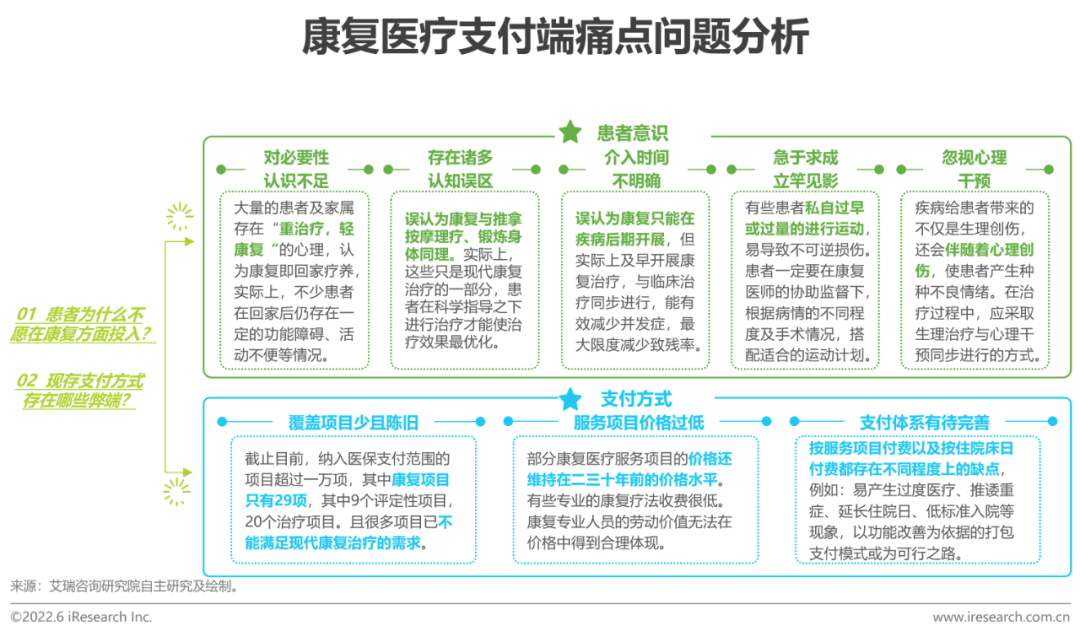 康復(fù)醫(yī)療的發(fā)展很大程度上需要支付端的不斷推動(dòng),目前我國(guó)人均康復(fù)花費(fèi)較低,對(duì)于市場(chǎng)的進(jìn)一步擴(kuò)容造成了阻礙。艾瑞認(rèn)為,目前我國(guó)康復(fù)醫(yī)療支付端的痛點(diǎn)問(wèn)題主要集中在兩方面,首先,患者對(duì)于整體康復(fù)醫(yī)療的意識(shí)與認(rèn)知仍存在偏差,在康復(fù)方面投入資金的意愿不強(qiáng);其次,我國(guó)的醫(yī)保體系所覆蓋的康復(fù)類項(xiàng)目少且并沒(méi)有隨著醫(yī)療技術(shù)的發(fā)展而調(diào)整項(xiàng)目類型和項(xiàng)目?jī)r(jià)格,不符合目前的社會(huì)價(jià)值,整體體系有待完善,同時(shí)商保覆蓋率極低,目前只有少數(shù)高端商保有所涉及。