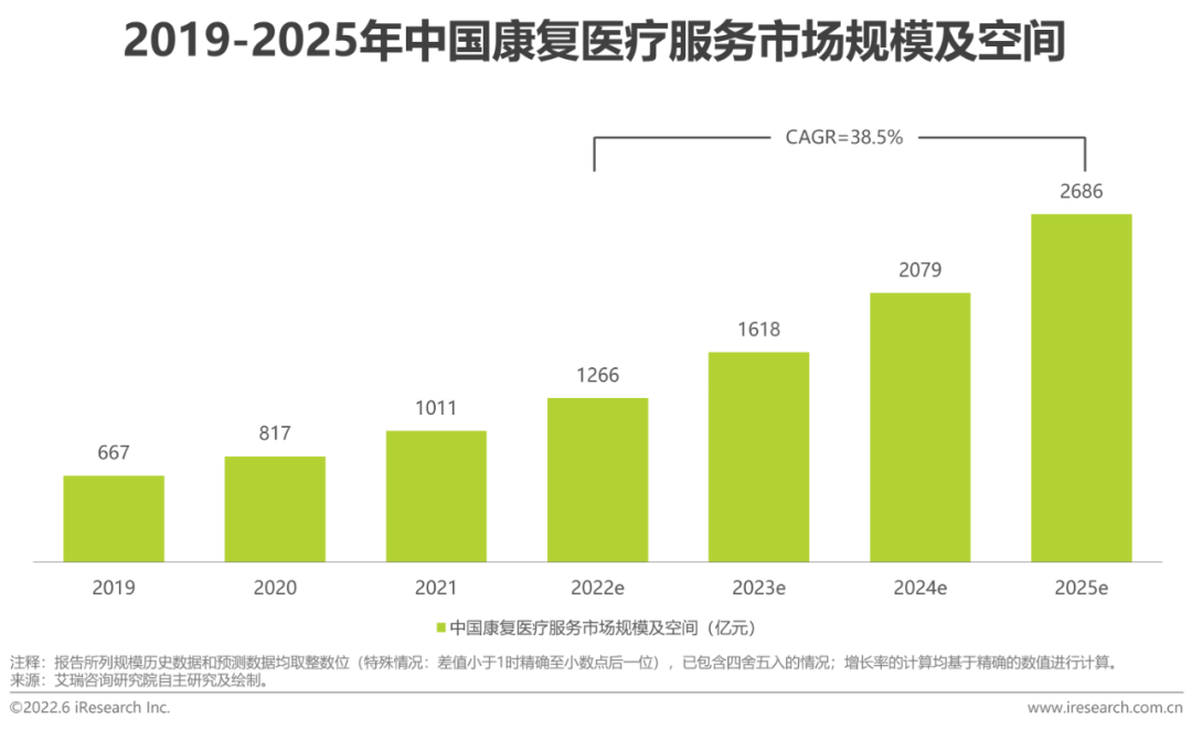 艾瑞研究發(fā)現(xiàn),2021年我國(guó)康復(fù)醫(yī)療服務(wù)行業(yè)市場(chǎng)規(guī)模約1011億元,未來(lái)在后疫情時(shí)代下,隨著人口老齡化的加速、國(guó)民康復(fù)意識(shí)的逐步覺(jué)醒以及國(guó)家政策的持續(xù)強(qiáng)力推動(dòng),康復(fù)醫(yī)療服務(wù)行業(yè)市場(chǎng)規(guī)模將持續(xù)增長(zhǎng),有望于2024年突破兩千億元,預(yù)計(jì)2025年中國(guó)康復(fù)醫(yī)療服務(wù)市場(chǎng)規(guī)模達(dá)2686億元,2022年至2025年CAGR約為38.5%,整體市場(chǎng)未來(lái)成長(zhǎng)空間廣闊。